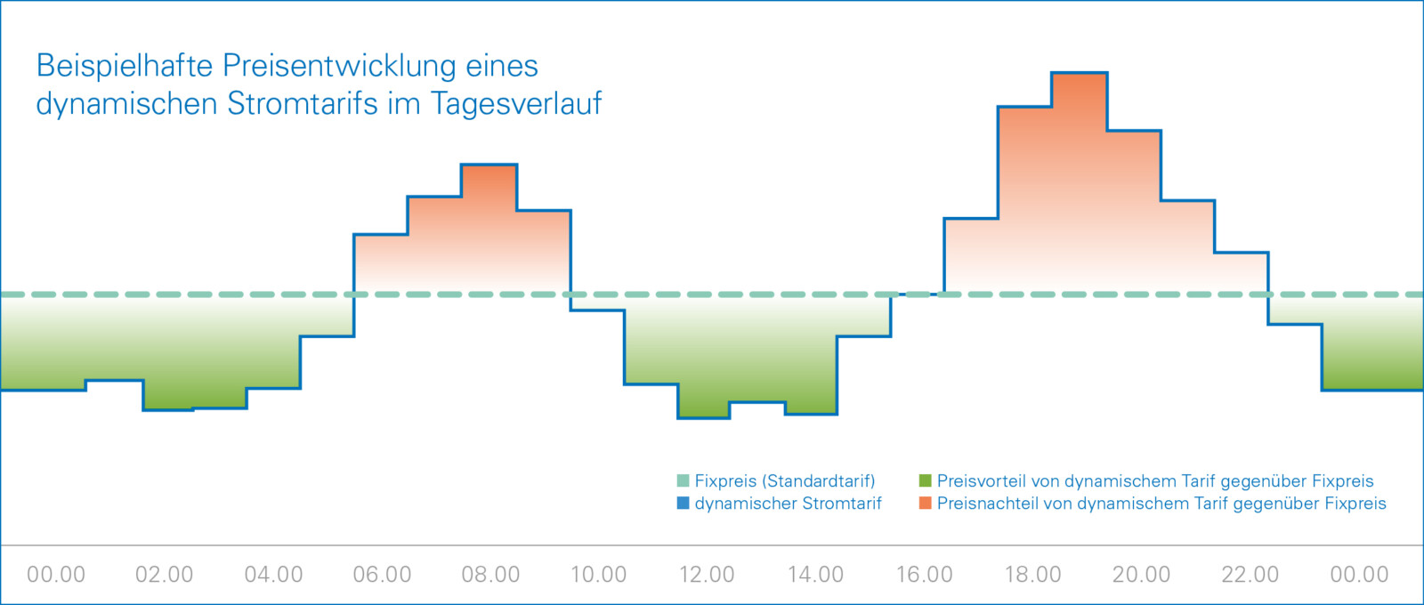 Voraussetzung für diesen Tarif ist der Einsatz eines intelligenten Messsystems, auch Smart Meter genannt. Dieses erfasst den Verbrauch in 15-Minuten-Intervallen und übermittelt die Daten an den Messstellenbetreiber und dieser wiederum an den Stromanbieter. Dadurch kann der Stromverbrauch genau nach den stündlichen Börsenpreisen abgerechnet werden. Kunden mit einem dynamischen Stromtarif erhalten eine monatliche Abrechnung. Besonders günstige Strompreise gibt es dann, wenn besonders viel aus erneuerbaren Quellen verfügbar und die Nachfrage gleichzeitig gering ist. Das ist an sonnigen Tagen beispielsweise mittags und nachmittags der Fall.