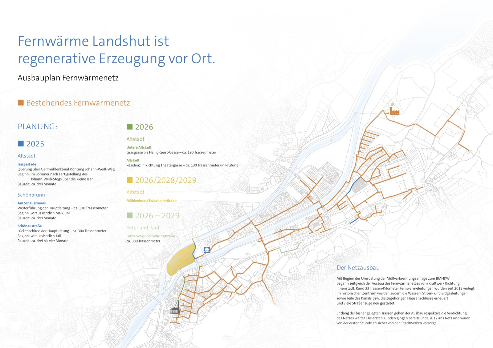 Der Ausbau des Fernwärmenetzes Landshut Ost erfolgt seit 2012 vom Biomasseheizkraftwerk in Richtung Innenstadt. Der Ausbau des Fernwärmenetzes Landshut West erfolgt ab Herbst 2021. Für mehr Informationen zu den Fernwärmenetzen klicken Sie bitte auf die Buttons.