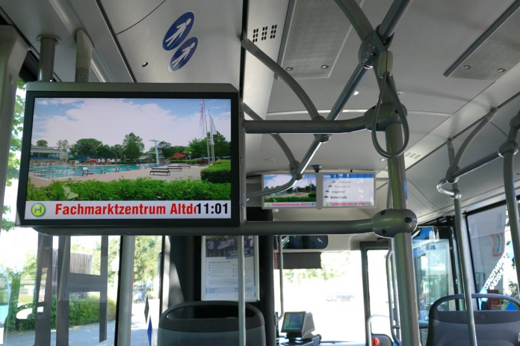 Die reichweitenstarke Bildschirmwerbung im Bus ist ideal für das kleine Budget. Das Werbemotiv läuft in der gesamten Busflotte (rund 60 Busse) direkt neben der Haltestellenanzeige. In rollierendem Wechsel mit aktuellen Informationen und anderen Werbemotiven erscheint Ihre Anzeige den gesamten Fahrbetrieb.