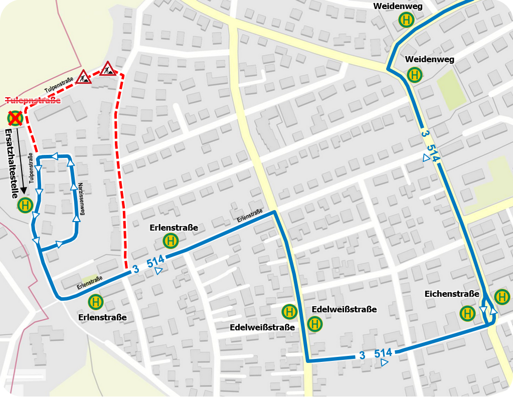 Aufgrund von Bauarbeiten im Einmündungsbereich Tulpenstraße/Asternweg werden die Linien 3 und 514 ab Donnerstag, 14.09., bis voraussichtlich Freitag, 13.10., über die Erlenstraße – Tulpenstraße – Narzissenweg umgeleitet.